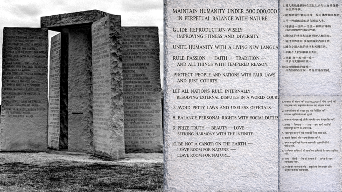 A Georgia Guidestones felirata [1980 március 22-én avatták fel. Tervezője ismeretlen. A gránitfaragók szerint a megrendelő nagyon részletes műszaki rajzokkal érkezett, ami arra utal, hogy a projektet hosszú ideig készítették elő. A gránit építményen (kivitelező Elberton Granite Finishing Company) lévő tíz irányelv az emberiség jövőjére vonatkozó filozófiai és társadalmi üzenetként szolgált Elbert megye (Georgia, Egyesült Államok) határában. Az irányelvek a külső négy kőlapon angol, spanyol, szuahéli és hindi nyelven, a belső központi kő négy oldalán pedig orosz, kínai, arab és héber nyelven olvashatók. A tetőkövön ugyanannak a mondatnak (’Legyenek ezek útmutató kövek az értelem korához’) a változata szerepel négy ősi írással: babiloni (akkád ékírás), görög (majuszkula, kőfelirat-stílus), szanszkrit (dévanágari) és egyiptomi hieroglifák. 2022. július 6.-án előzetes robbantás (vallás-fanatikusok az Antikrisztus művének tartották az irányköveket) után, biztonsági okokból gyorsan lebontották. A robbantók kilétére sem derült fény.] Az iránymondatok (2. kép): ’1./ Tartsd az emberiség létszámát 500 millió alatt, a természettel való tartós egyensúlyban [ma 8,3 milliárd → a források szűkössége miatt születésszabályozás bevezetésére hívja fel a figyelmet]; 2./ Irányítsd bölcsen a szaporodást, javítva az egészséget és a sokféleséget [eugenika?]; 3./ Egyesítsd az emberiséget egy élő, új nyelvvel [nemzetek lebontása]; 4./ Uralkodj a szenvedélyen, a hiten, a hagyományon és minden máson mértéktartó értelemmel; 5./ Védd az embereket és a nemzeteket igazságos törvényekkel és méltányos bíróságokkal; 6./ Hagyd, hogy minden nemzet belügyeiben önállóan kormányozzon [önálló nyelv nélkül milyen nemzet létezik?], a külső vitákat pedig bolygóbíróság rendezze; 7./ Kerüld a jelentéktelen törvényeket és a haszontalan hivatalnokokat; 8./ Tarts egyensúlyt az egyéni jogok és a társadalmi kötelességek [!] között; 9./ Becsüld az igazságot, a szépséget, a szeretetet és keresd az összhangot a végtelennel [talán a természet törvényszerűségeit jelenti]; 10./ Ne légy rákfene a Földön, hagyj helyet a természetnek. Hagyj helyet a természetnek.’