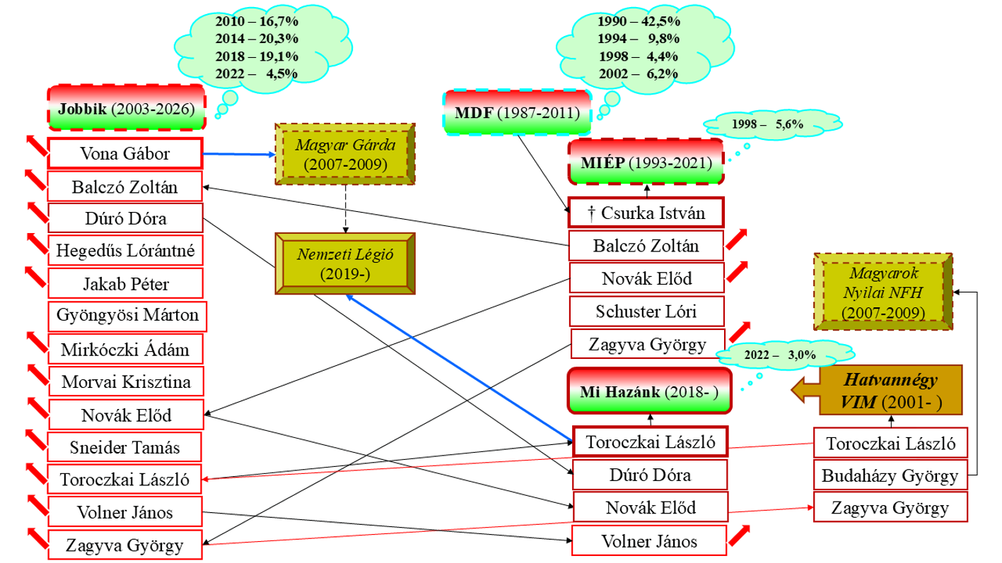 3.ábra: A hazai radikális jobboldal (MIÉP → Jobbik → Mi Hazánk Mozgalom) színeváltozásai