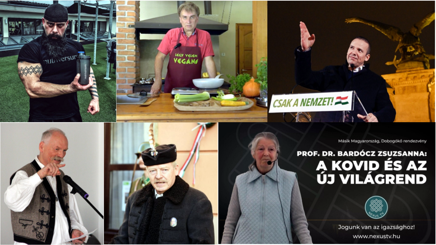 6.kép: A Covid-19 kapcsán születő konspirációs teóriák magyar fellépői (megjegyzések: fenti sor – a Gödény György, Tamasi József, Toroczkai László; alsó sor – Pócs Alfréd, Patrubány Miklós és Bardócz Zsuzsanna)