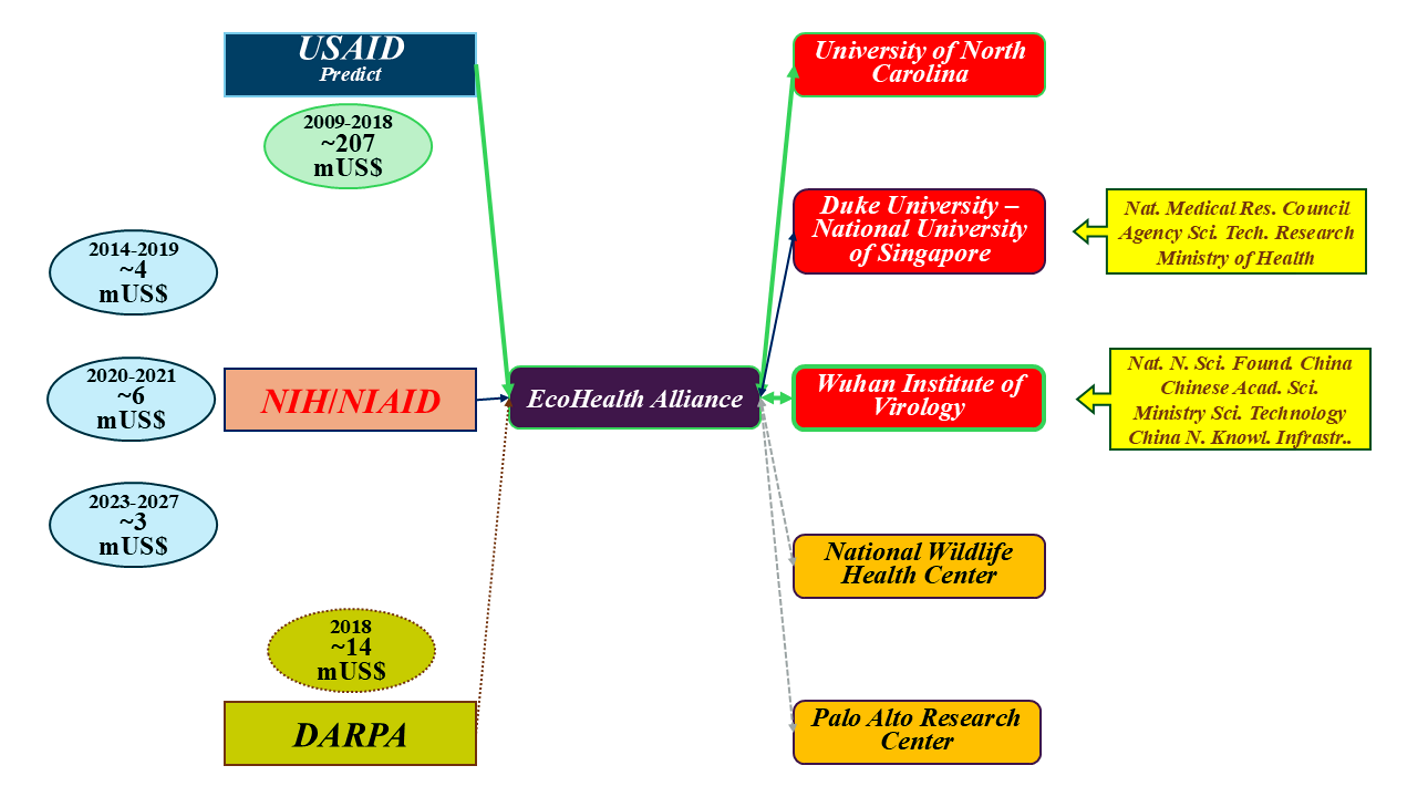 A sokféle forrásból kompilált támogatási vázlatban nem tüntettem fel a vakcinafejlesztésre fordított amerikai milliárdokat, amelyet a NIH finanszírozott. Az amerikai pályázati pénz mellett – kevésbé átlátható módon – kínai és szingapúri pályázati támogatások is jelentősek voltak. A Wuhani Virológiai Intézet (WIV) a komoly pályázatokból kihagyhatatlan volt, hiszen Yunnan-tartomány barlangjaiban élő patkósorrú denevérek biológiai mintáiból gyűjtve itt volt található a legjelentősebb SARS-vírusgyűjtemény. Anthony Fauci doktor eskü alatt tett vallomásával ellentétben 2014-től (mások szerint 2009-től) a NIH közvetve – az EcoHealth Allience szervezetén keresztül, mint alvállalkozót – támogatta a WIV-ben folyó koronavírus-kutatásokat. Mindehhez a WIV kínai támogatást is kapott a hazai pályázati rendszeren keresztül (14. ábra). Hasonló mondható a szingapúri társkutató intézet körülményeiről.