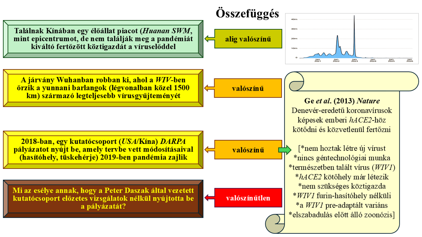 Összegzés: bizonyítottnak az 1-6 pontokat tarthatjuk (15. ábra), a 7. pont következtetés, a 8. pont feltételezés. Ezek alapján azt állítani, hogy a géntechnológiai beavatkozás valószínűtlen (WHO) csupán politikai menekülés a felelősség elől, hiszen több millió ember halála áll szemben személyek, intézetek és országok felelősségével. Egyrészt láthatunk kivizsgálásra alkalmatlan politikai légkört, lapító tudományos közösséget és az ügy feltárására előtérbe tolakodó, abból alig valamit megértő és érdemben követni képtelen összeesküvésteória-gyártó politikai szereplőket. Ez utóbbi ködösítés szintén az érdemi feltárással szemben hat.